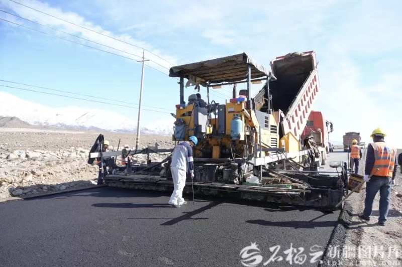 10月17日,哈密市天山南坡城镇连接线(二期)工程建造项目二标段的施工现场,摊铺机正有条有理地摊铺沥青路面。杨宏建摄